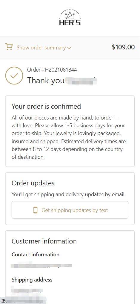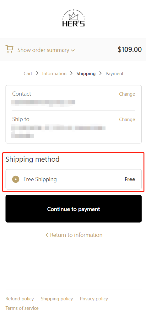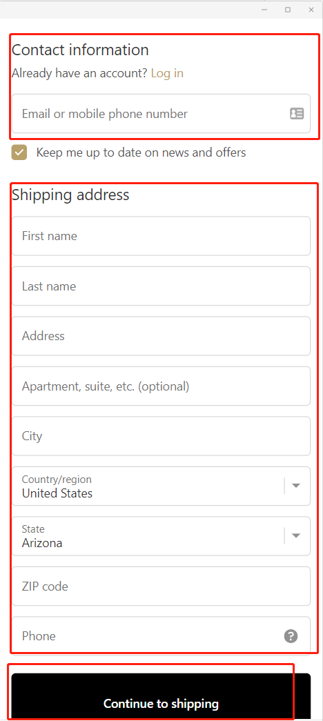 Enter your Contact information (email or phone number) and shipping address by filling in all fields. Please ensure that your data is correct and then click “Continue to shipping”.